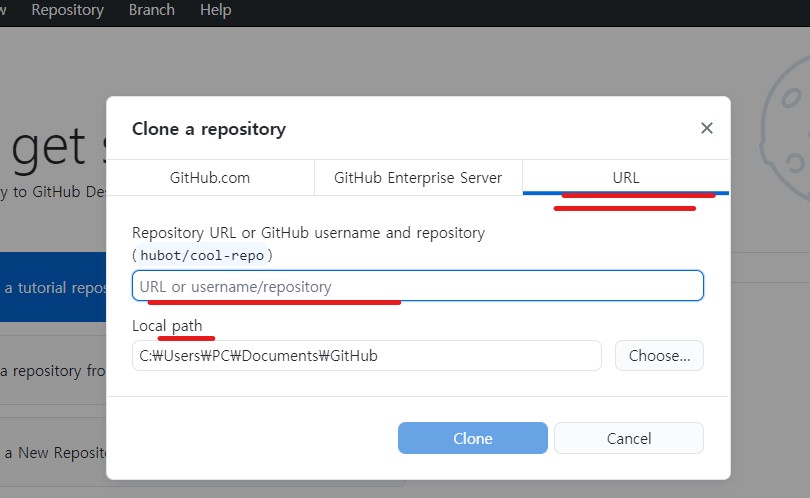 웹사이트에서 리포지토리의 CODE 버튼을 눌러 URL 을 복사해 붙여넣고