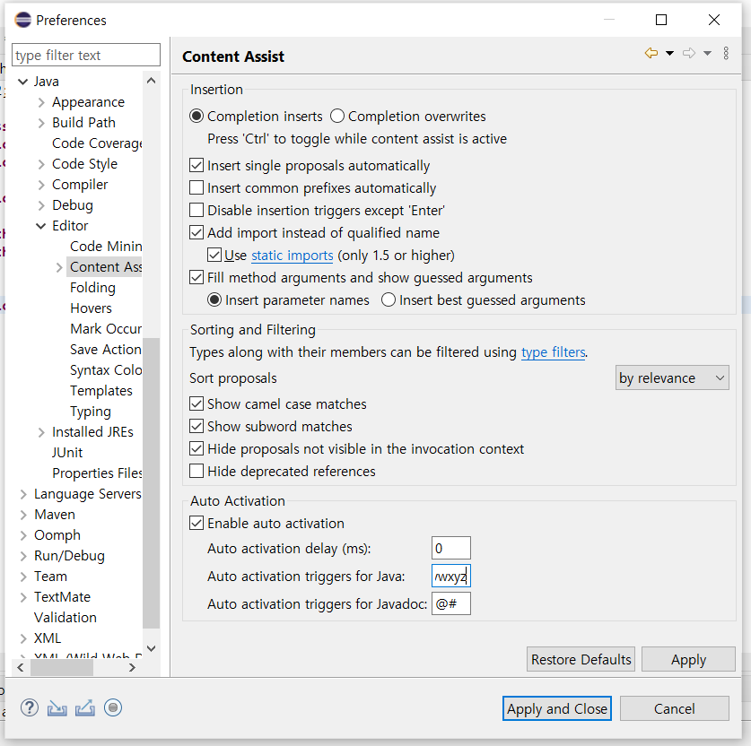 왼쪽 카테고리에서 JAVA -> EDITOR -> CONTENT Assist 들어가셔서