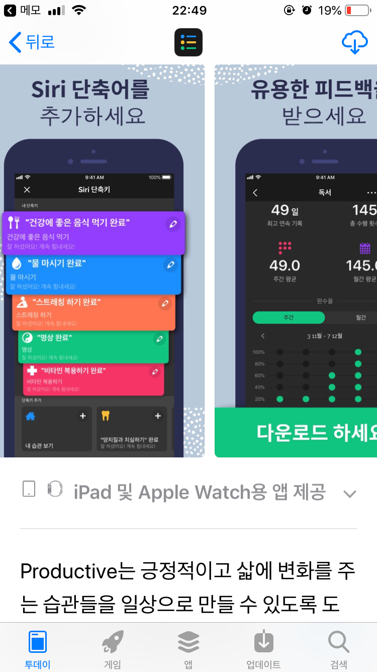 Productive는 긍정적이고 삷에 변화를 주는 습관들을 일상으로 만들 수 있도록 도와주는 쉬운 조작법의 무료 도구입니다. 개인적인 목표를 설정하고 진도를 기록하고 새로운 한계에 도전할 수