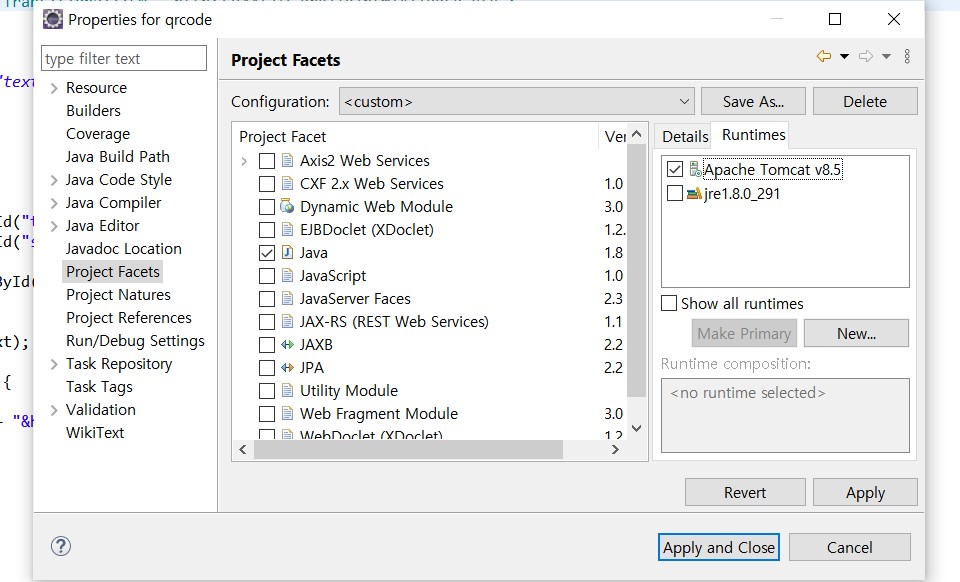 facets 설정에서 Runtimes 에 아파치 톰캣 서버를 체크해 적용해주기