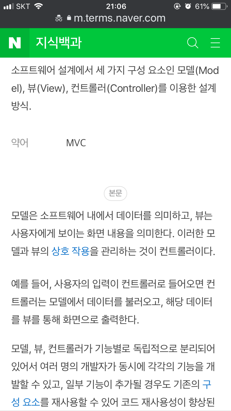 소프트웨어 설계에서 세 가지 구성 요소인 모델(Model), 뷰(View), 컨트롤러(Controller)를 이용한 설계 방식. 모델은 소프트웨어 내에서 데이터를 의미하고, 뷰는 사용자에게 보이는 화면 내용을 의미