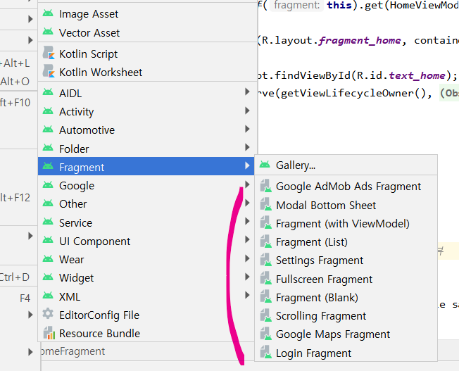 app 폴더 우클릭 - new- Fragment - 원하는 프래그먼트