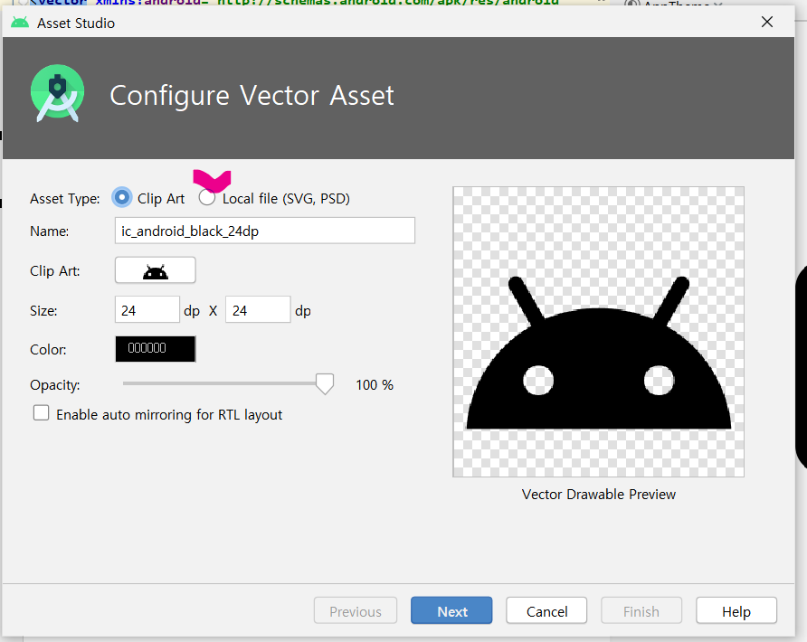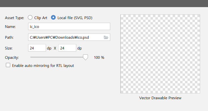 - Resource Manager -> + 버튼 -> Vector Asset