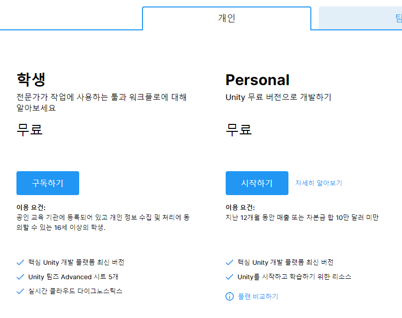 각 플랜별 차이를 확인하고 파란버튼을 누릅니다