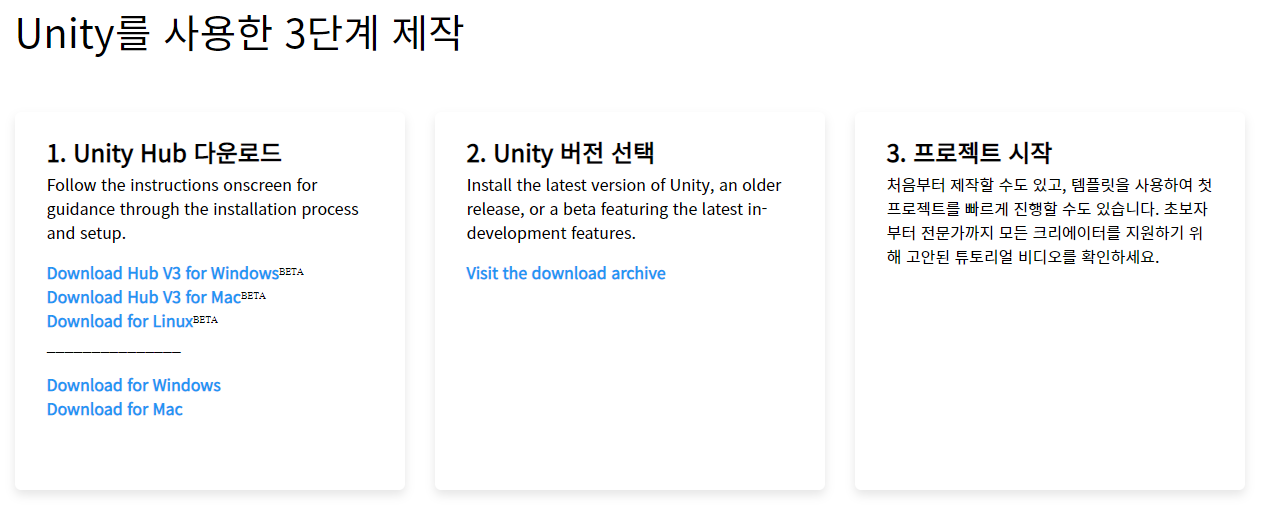 아래 링크의 공식 유니티 사이트에서 다운로드 하게 됩니다