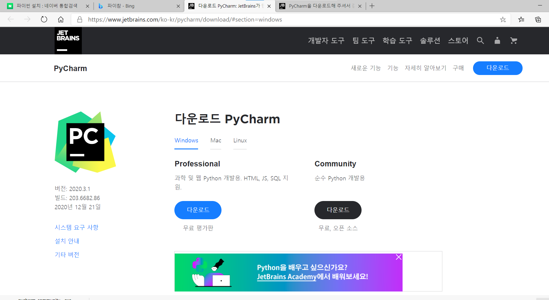 https://www.jetbrains.com/ko-kr/pycharm/download/#section=windows